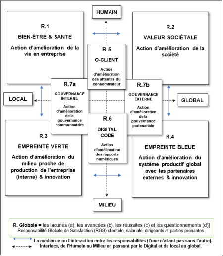 Cette matrice est dynamique dans un va-et-vient entre le local et le global, mais aussi du local (Bien-être et santé) au local (empreinte verte)avec par exemple l’ergonomie au travail et le respect des populations locales, voire de l’emploi local qui vont de pair dans ce que les parties prenantes se font d’une entreprise responsable. Il en est de même à l’échelle globale où les Valeurs Sociétales et l’Empreinte Bleue se répondent par des représentations positives de l’action d’entreprendre en se conjuguant avec les efforts pour une préservation de notre biosphère. Les humains et leurs milieux mettent en avant un constat sur les exigences de responsabilité entre les parties prenantes.